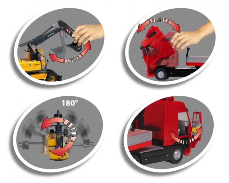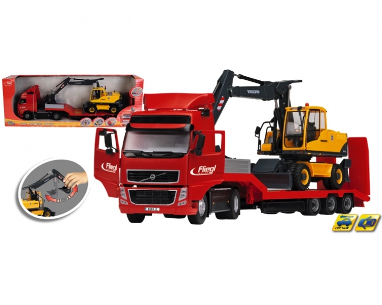 С удивительным игровым набором от Dickie любая игра малыша в стройку станет еще интереснее и реалистичнее. В комплект набора входит большой трейлер-погрузчик и экскаватор. Фрикционный погрузчик является детализированной копией реальной модели от Volvo и обладает открывающимися дверьми, платформой для заезда и съезда перевозимой спецтехники, а также опускаемой кабиной водителя. У экскаватора же подымает ковш, а кабина водителя может вращаться на 180 градусов.