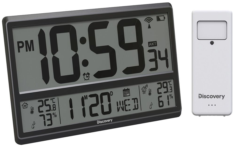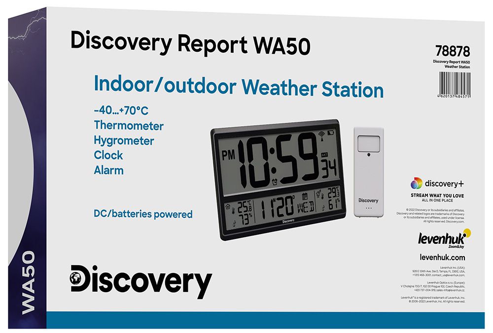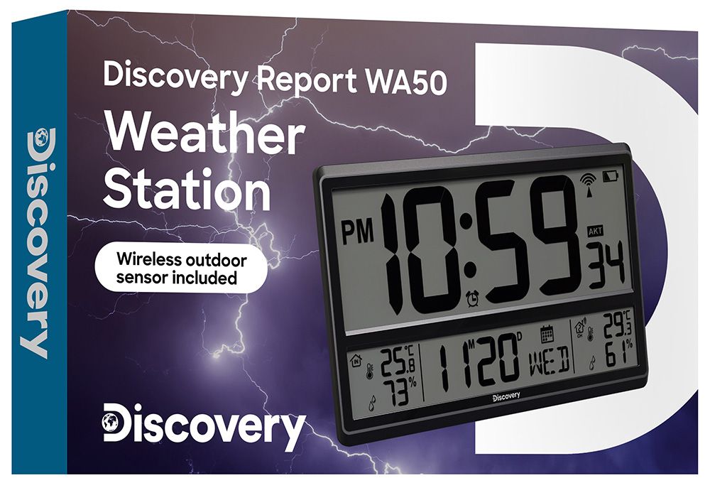 Метеостанция Discovery Report WA50 – стильный и запоминающийся с первого взгляда гаджет, который будет приятно подарить или получить в подарок. Благодаря тонким рамкам корпуса дизайн прибора очень воздушный и легкий, при этом функциональность не уступает аналогам. Метеостанция определяет температуру и уровень атмосферного давления, показывает время, дату и день недели, также есть будильник. В комплектацию включен выносной термогигрометр (датчик).