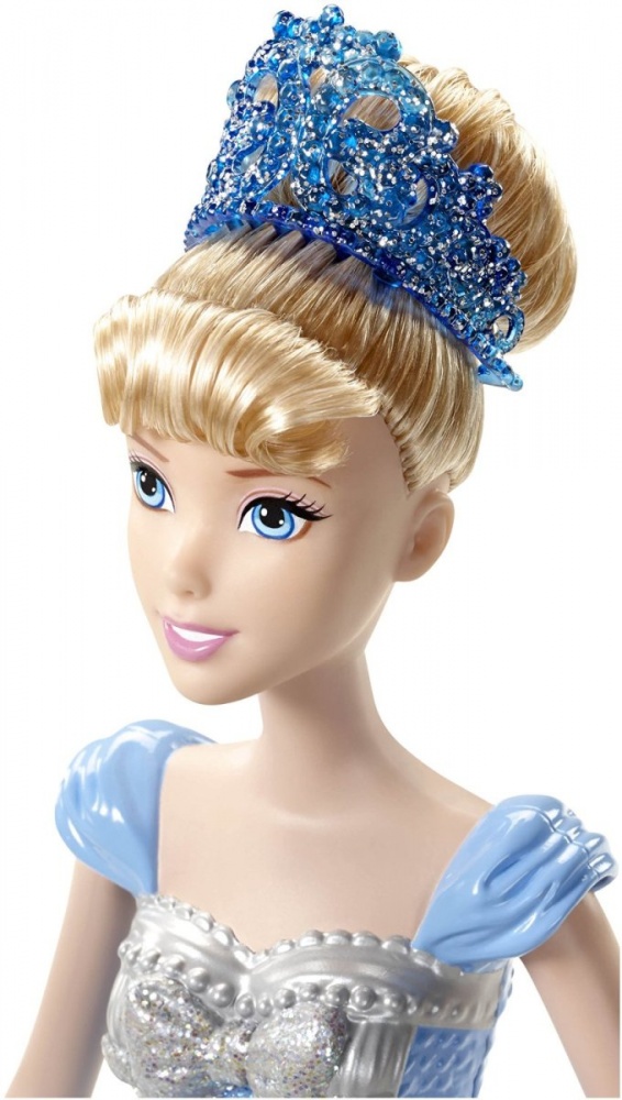 Густые золотые волосы куклы убраны в высокую прическу, как в мультике, а держит ее голубая диадема.