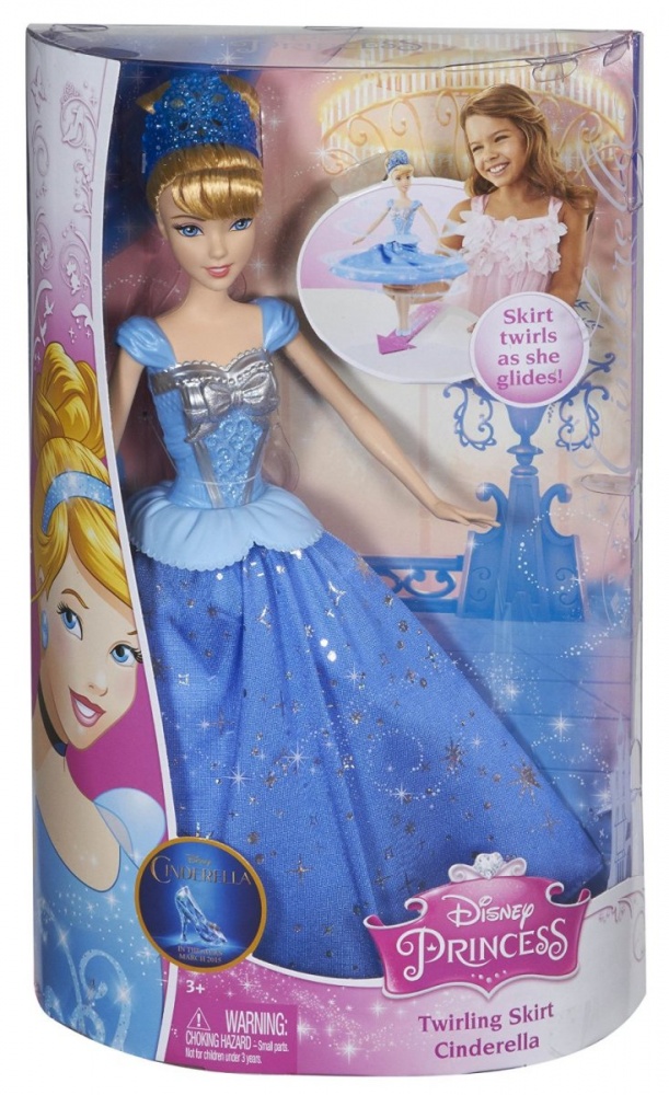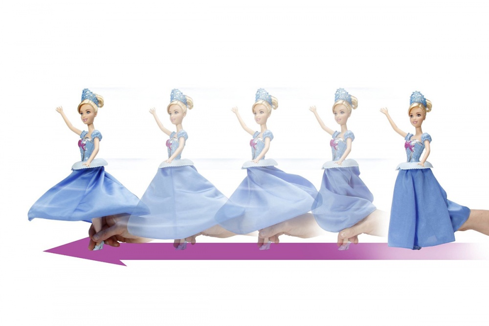 Кукла Золушка одета в свое бальное платье, которое живописно развевается в танце! В ногах расположены небольшие колесики, если катить ее по ровной поверхности, они приводят в действие механизм, который раскручивает ее юбку. От этого юбка кружится так, как если бы принцесса танцевала вальс на балу!