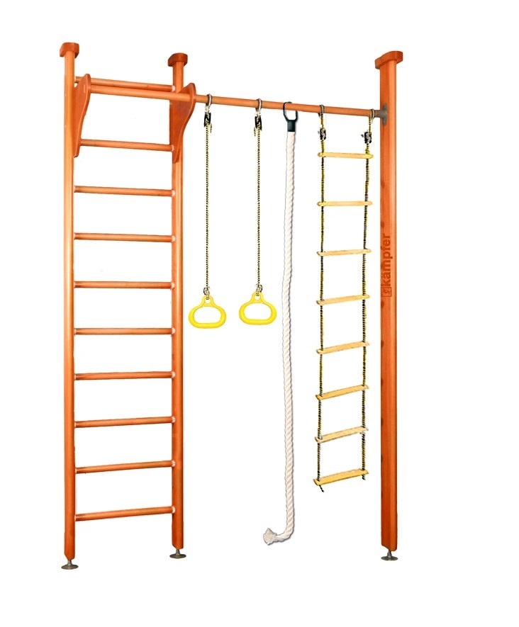 Деревянный спортивный комплекс Line создан для активного времяпрепровождения всех членов семьи. Конструкция не имеет острых углов, безопасна для игры детей. Деревянные элементы комплекса покрыты защитным составом, продлевающим срок службы изделия. Для защиты хрупких стен используется крепление враспор, обеспечивающее быструю перестановку комплекса внутри помещения. Данная модель представлена последовательно расположенными снарядами — шведской стенкой, двумя гимнастическими кольцами, канатом и подвесной лестницей.