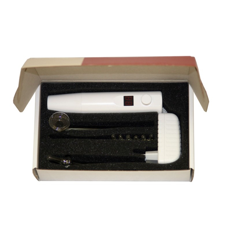 На передней стороне корпуса есть маленький цветной дисплей. Прибор очень легкий и весит всего 500 г. вместе с электродом. Режим работы аппарата составляет 20 минут с интервалом в 20 минут. Работает аппарат от сети. Напряжение в приборе на выходе можно регулировать от 2 до 20 кВ.