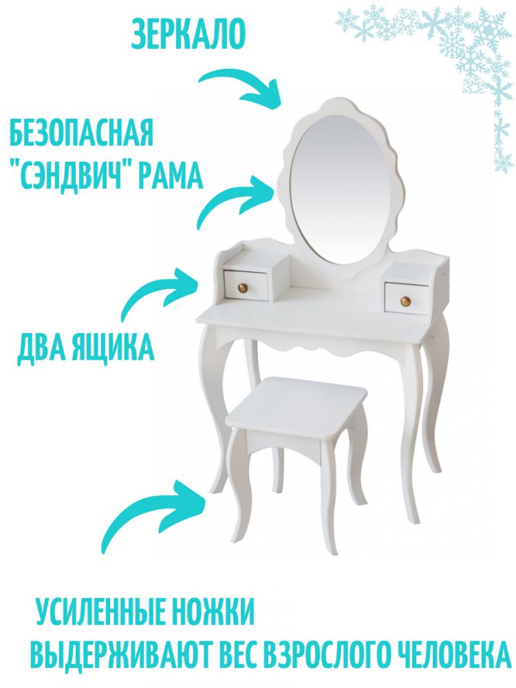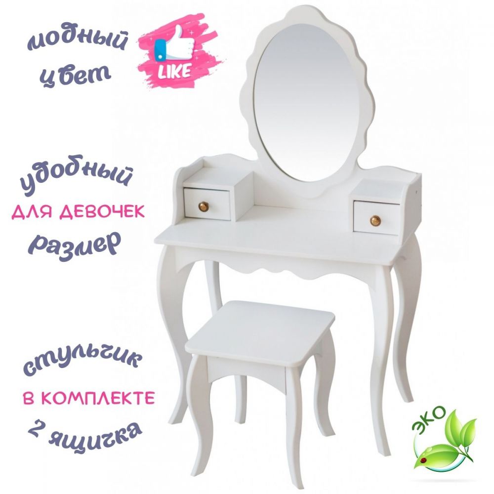 Туалетный столик "Эльза" – замечательный подарок для девочки. Изящная форма, надежная конструкция и элегантный белый цвет делают его фаворитом среди детской мебели.