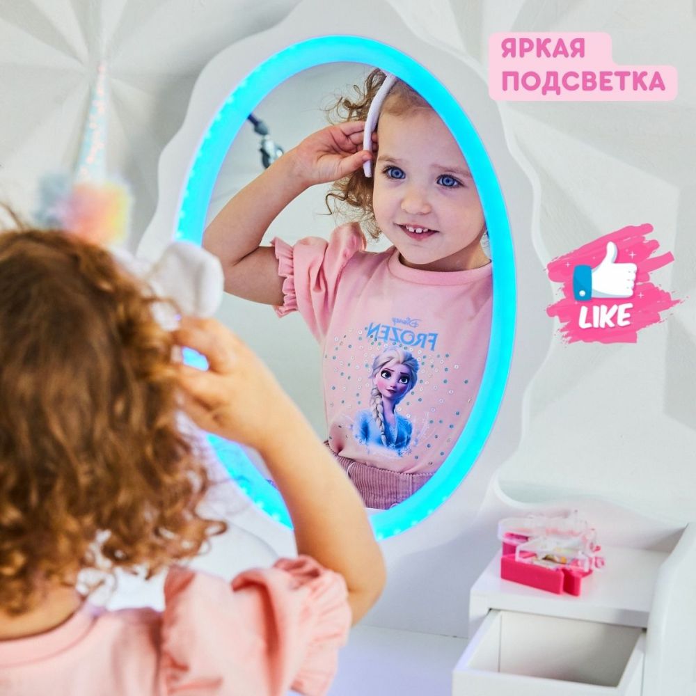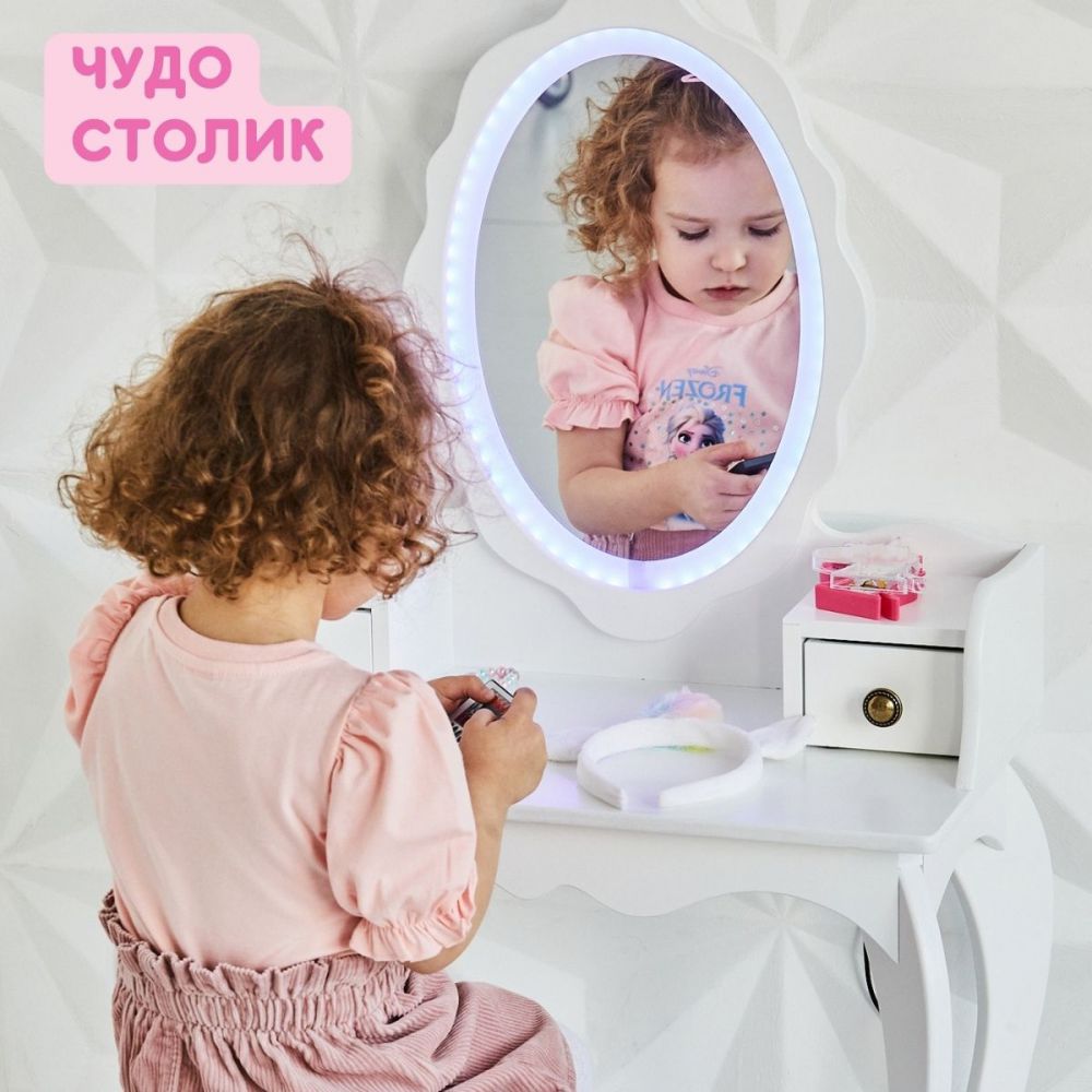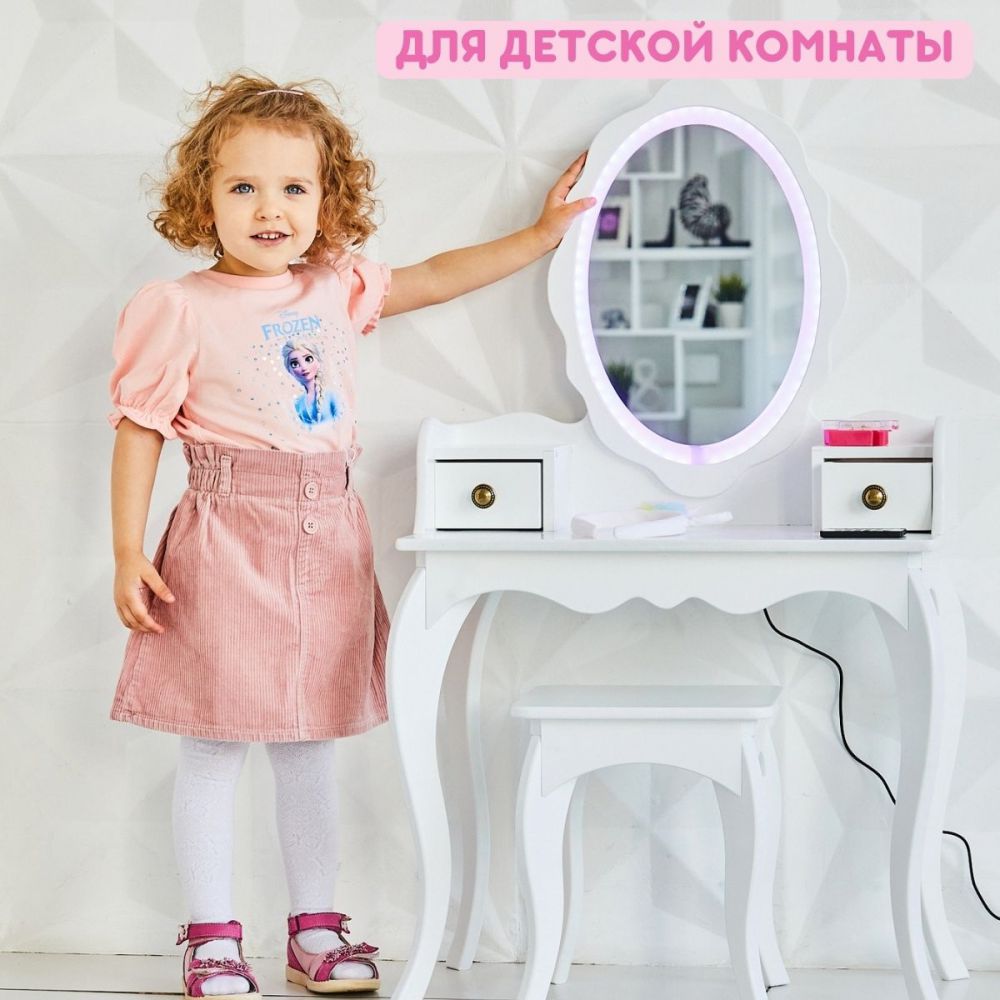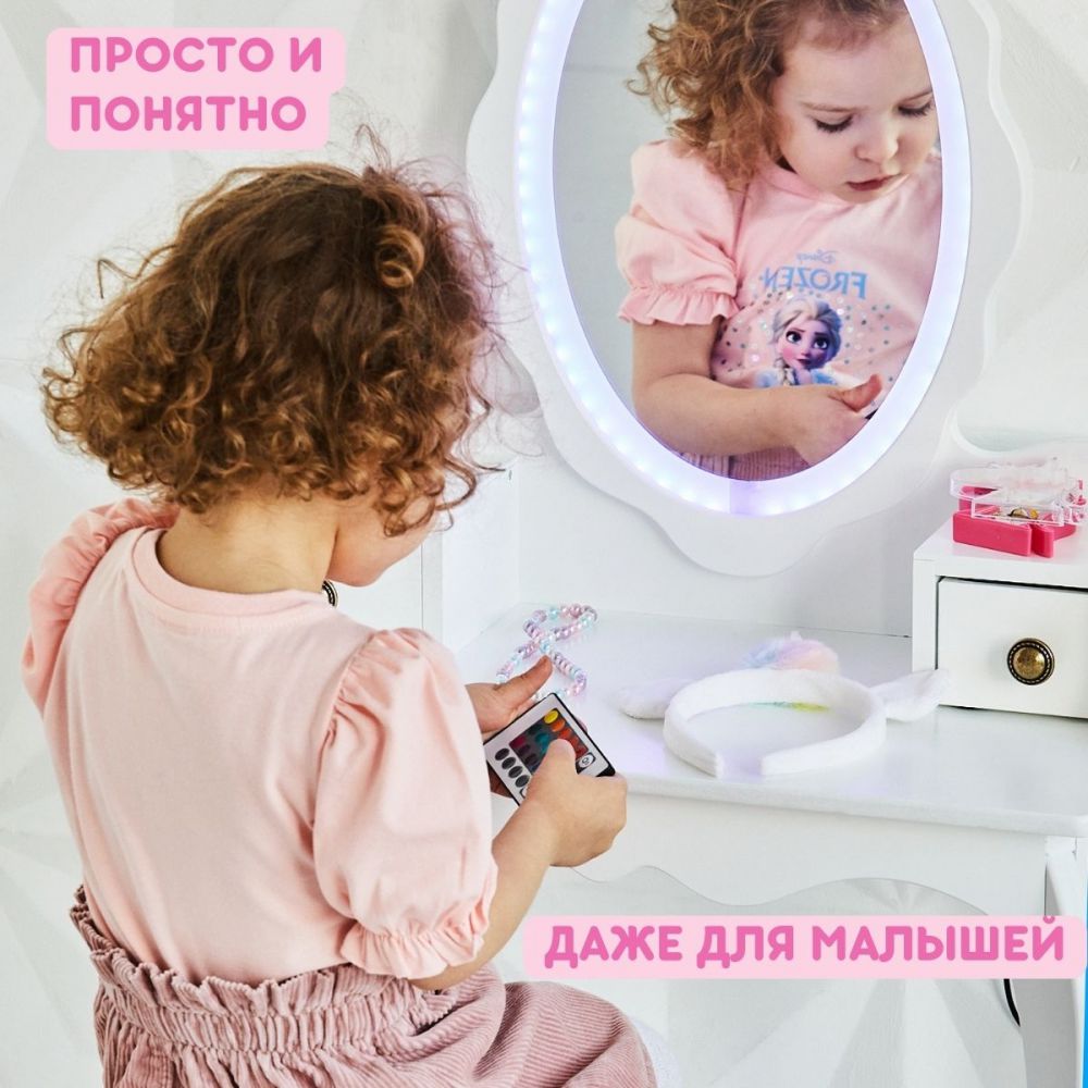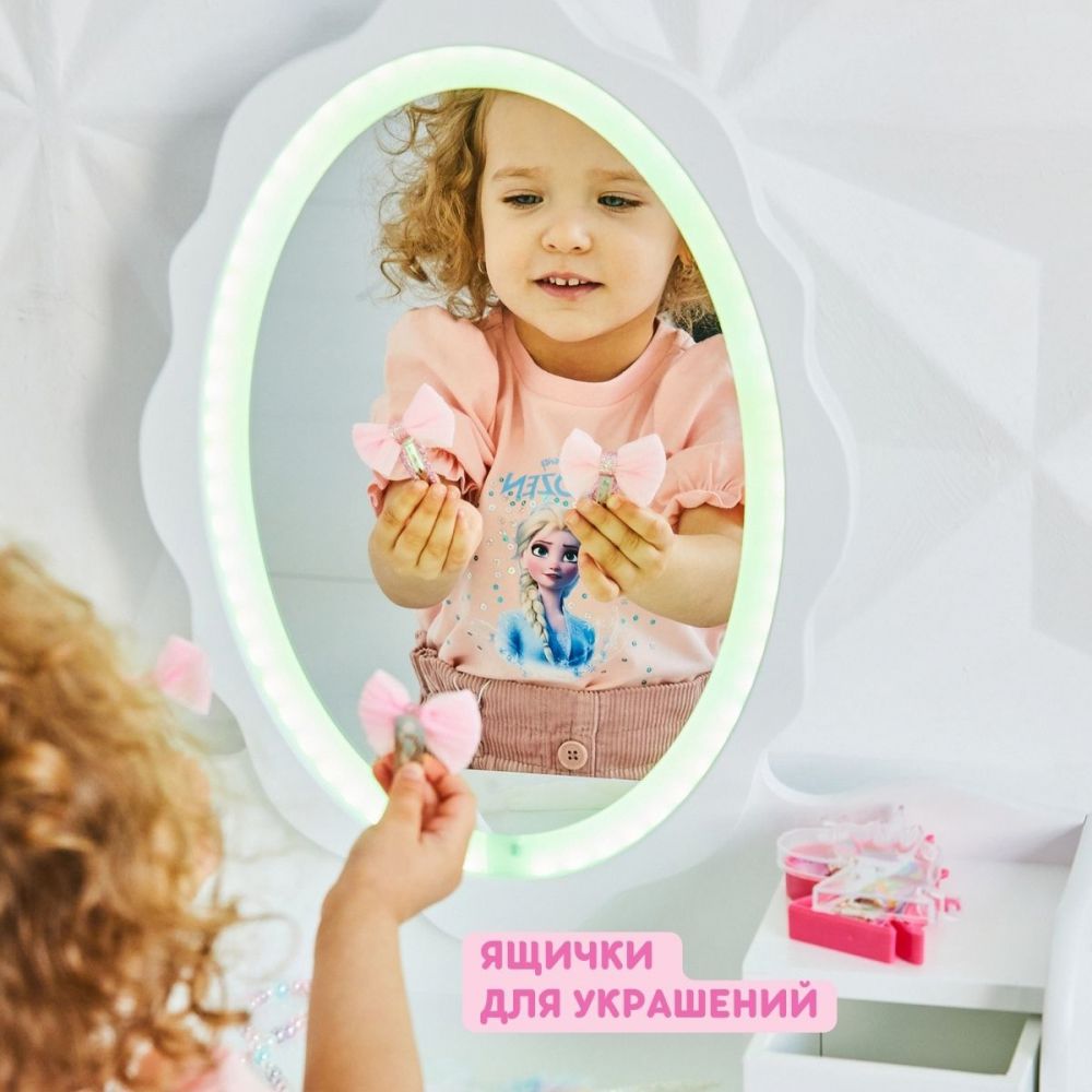 Изящный туалетный столик Принцесса «Эльза» - прекрасное сочетание классической надежной детской мебели и оригинального решения по подсветке зеркала.