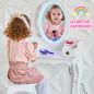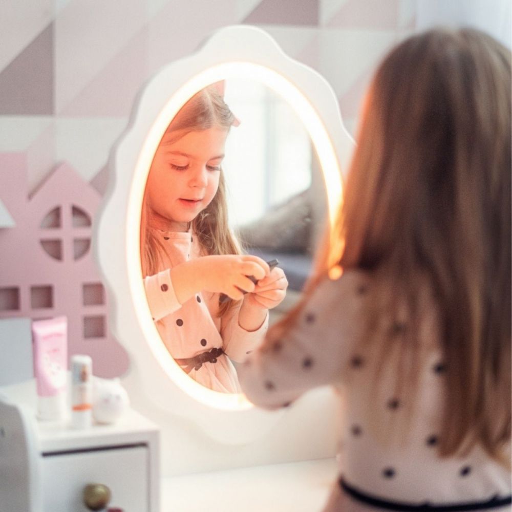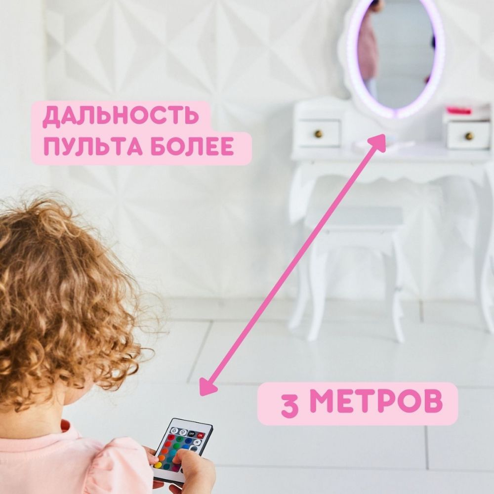 Множество цветовых вариантов подсветки создают в детской комнате поистине волшебную атмосферу. В программе заложено 16 цветов светового обрамления зеркала (синий, голубой, фиолетовый, оранжевый, красный, пурпурный, зеленый, салатный, желтый, розовый, белый и т.д.), а также 4 режима мерцания (автоматическая смена цветов по очереди), и функции ярче – бледнее.