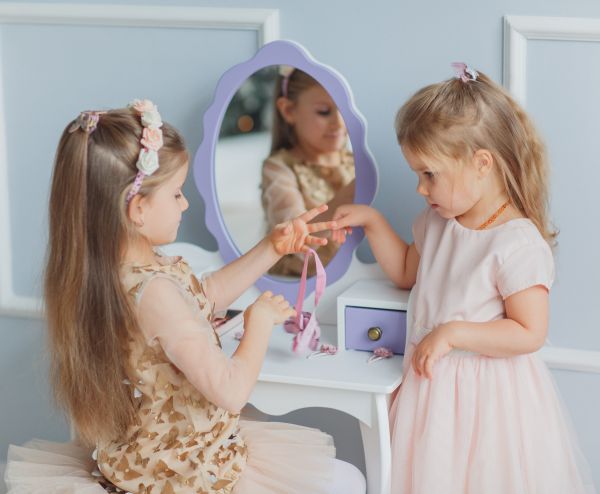 Модель имеет 2 ящика в которых можно разместить бижутерию. А на столешнице и полочках над ящиками можно расставить любимые фигурки, или положить детскую косметику.