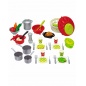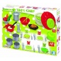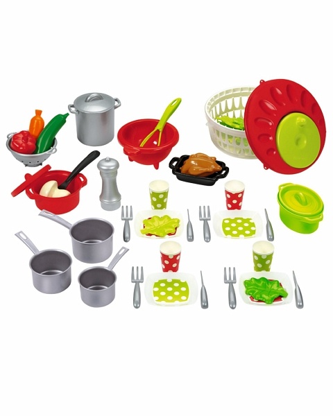 В комплекте 2 кастрюльки с крышками, 3 ковшика, 4 тарелочки, 4 стаканчика, вилки и ножи на 4 персоны, сушка для салата, дуршлаг, миска, утятница, форма для запекания, муляжи продуктов (курица, морковка, кабачок, грибок, листья салата, перец).