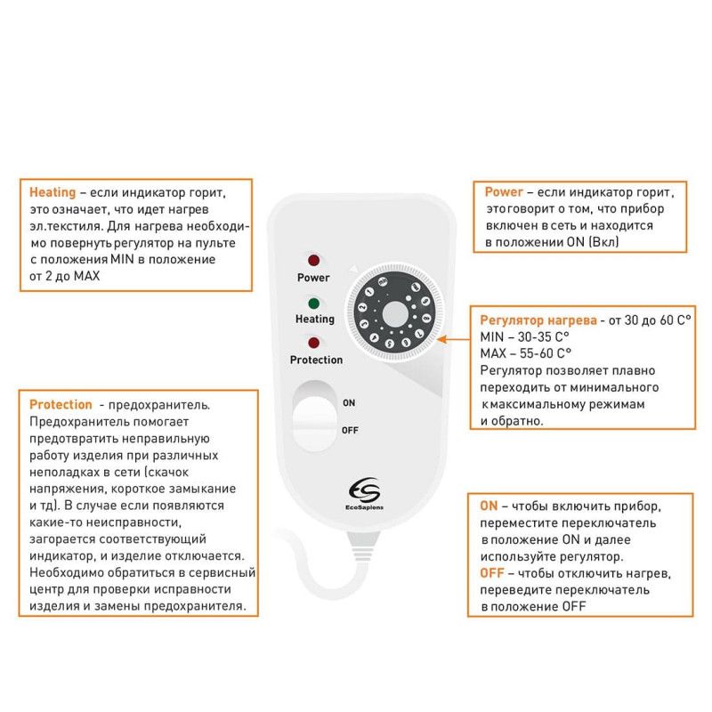Настройка температурного режима производится дистанционным пультом с механическим рычажком. Простынь с двух сторон покрыта натуральным хлопком, не вызывающим кожные реакции.