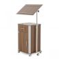 Буковый каркас изделия отличается прочностью, долговечностью и экологичностью. В тумбе предусмотрены открытая ниша, выдвижной и закрывающийся ящики. Высота столешницы регулируется механически. Наличие колес облегчает передвижение тумбы внутри помещения.