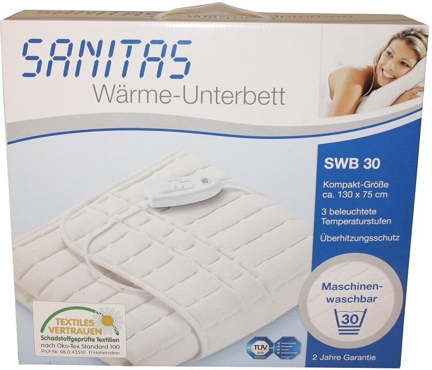 Sanitas SWB30 можно стирать в стиральной машине при 30-40 градусах: для этого достаточно отсоединить провод питания. Модель подходит для дома, дачи, медучреждения, но без розетки она не работает. Данная электропростынь осуществляет подогрев кроватей. Имеет возможность работы в трех температурных режимах. Встроенная система защиты выключает прибор в случае какого-либо сбоя, поэтому Вы можете не беспокоиться о собственной безопасности, засыпая на данной электропрoстыни. Прибор прост в стирке. Флис – материал, из которого изготовлена верхняя сторона. Имеется встроенный дисплей со светодиодной подсветкой.