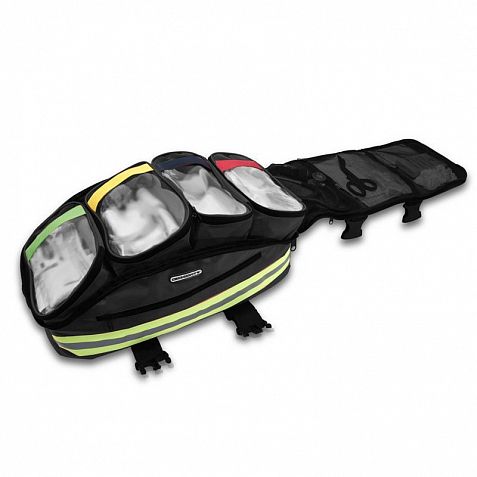 Рюкзак базового жизнеобеспечения трапециевидной формы, предназначенный для проведения спасательных работ или вмешательств в различных сценариях, включая труднодоступные районы, горы и/или замкнутые пространства.
