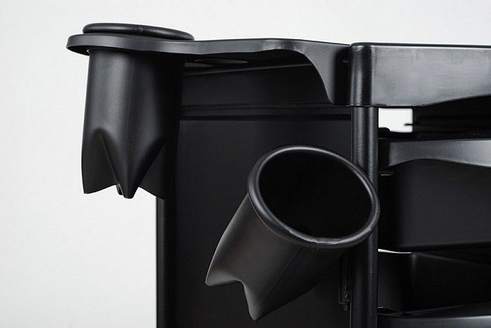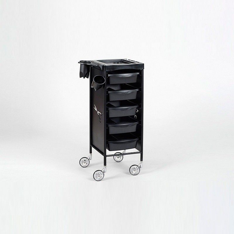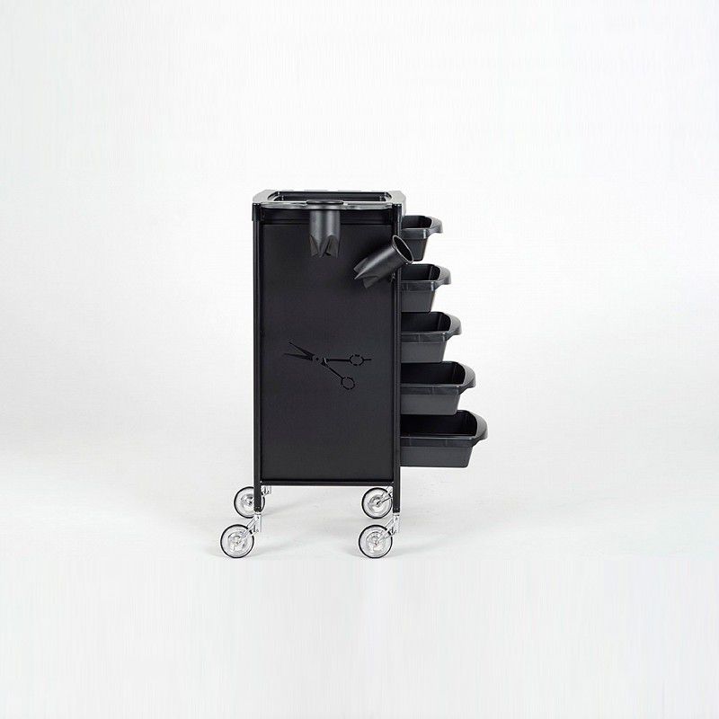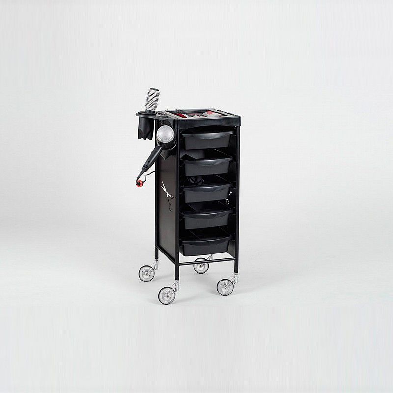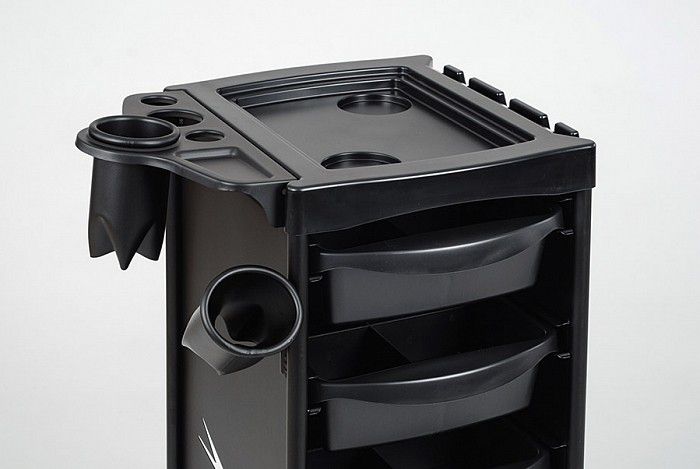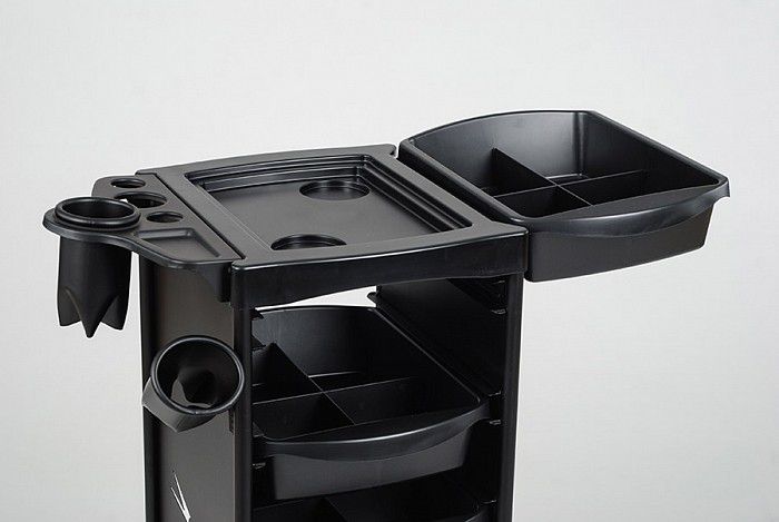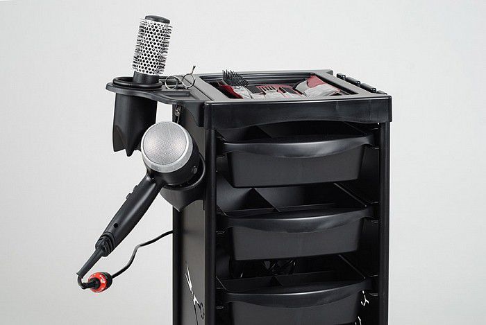 Конструкция оснащена держателем фена и навесной панелью для плоек и горячих ножниц. Прорезиненные колеса обеспечивают бесшумное передвижение тележки.