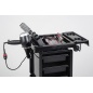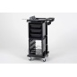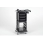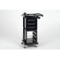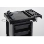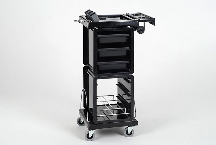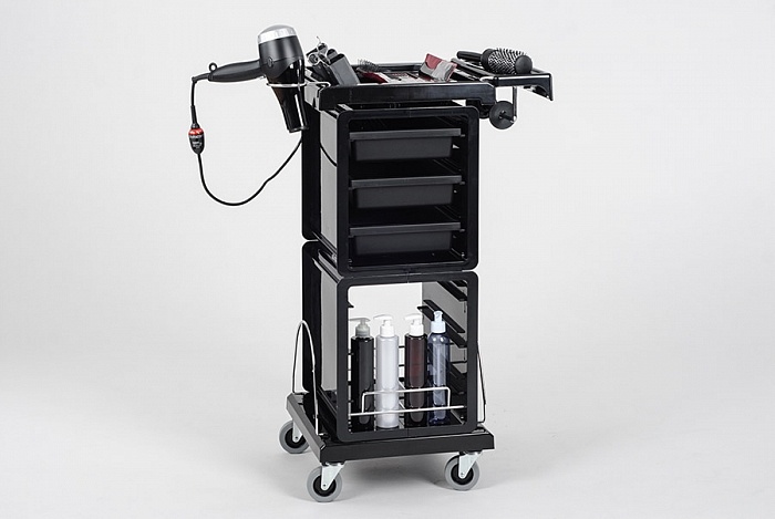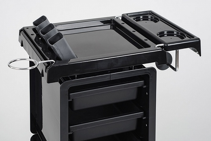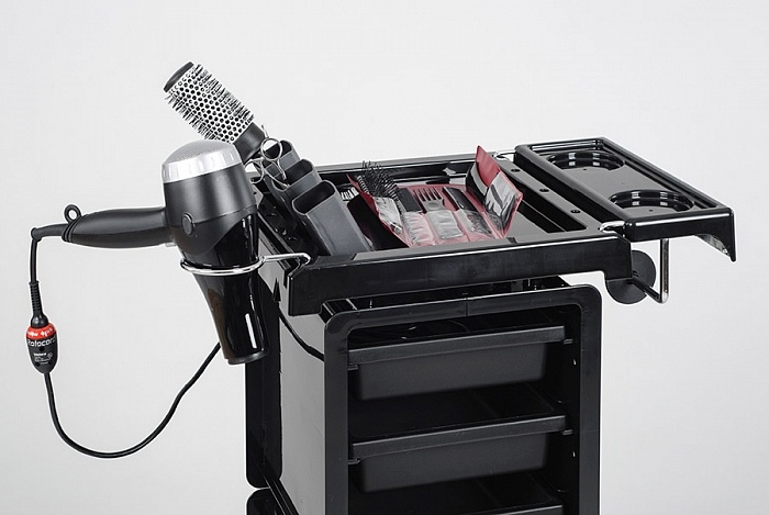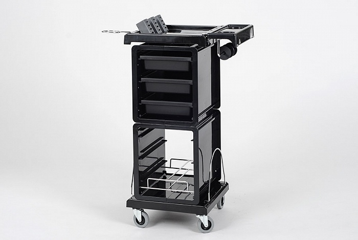 Парикмахерская тележка QA0015 предназначена для парикмахерских и салонов красоты. Корпус модели выполнен из ударопрочного пластика, внизу расположена секция для хранения высоких ёмкостей. Каждый из ящиков можно зафиксировать на столешнице. В комплект входят держатели для фенов, горячих инструментов и полотенец.