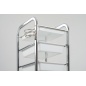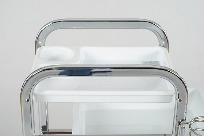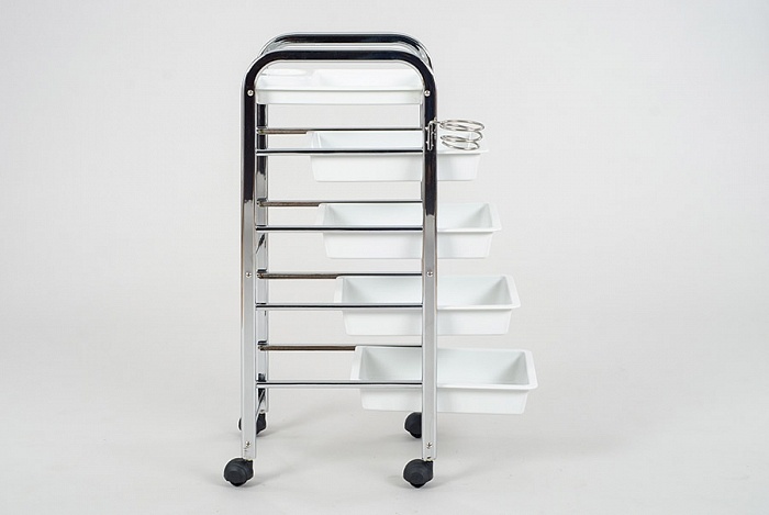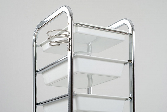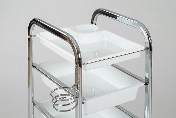 Парикмахерская тележка SD-3020A с держателем для фена. Для создания модели используются легкие хромированные трубы, маневренные колеса и пластик повышенной прочности. Гладкий материал обладает гидрофобными свойствами, устойчив к воздействию красителей и отчищается обычными средствами для уборки.