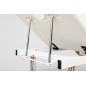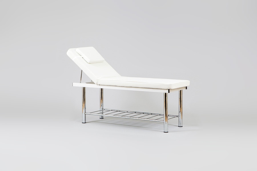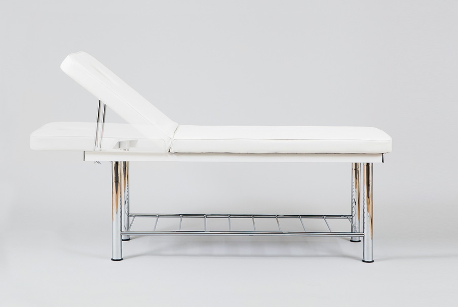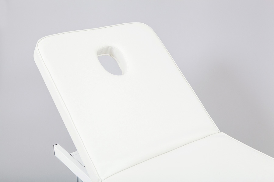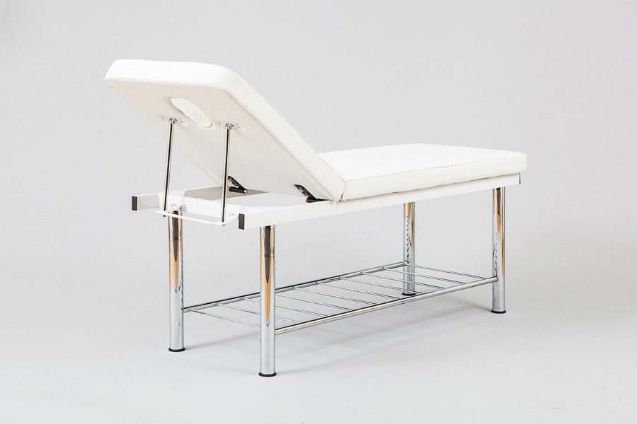 Данная массажная кушетка является стационарной, но ее конструкция позволяет регулировать угол наклона спинки и положение подголовника, в котором имеется отверстие для лица. В нижней части стола располагается удобная полочка для хранения полотенец и других принадлежностей и аксессуаров. Мягкие элементы обиты современной экокожей, которая легко дезинфицируется и моется. В комплект поставки входит подушка для головы.