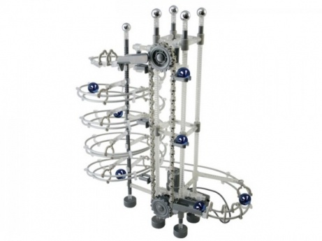 В состав конструкции - входит лебедка, поднимающая шарики вверх, и рельсы, по которым шарики скатываются вниз. Рельсы можно соединять как угодно, отклоняясь от инструкции и создавая собственную индивидуальную модель.