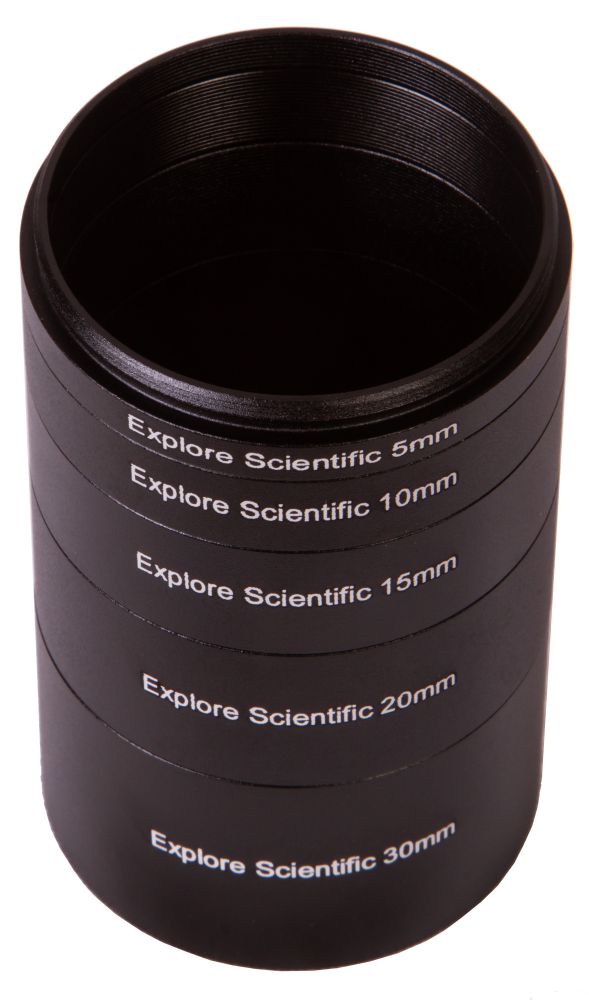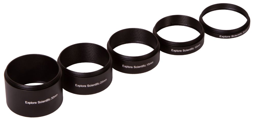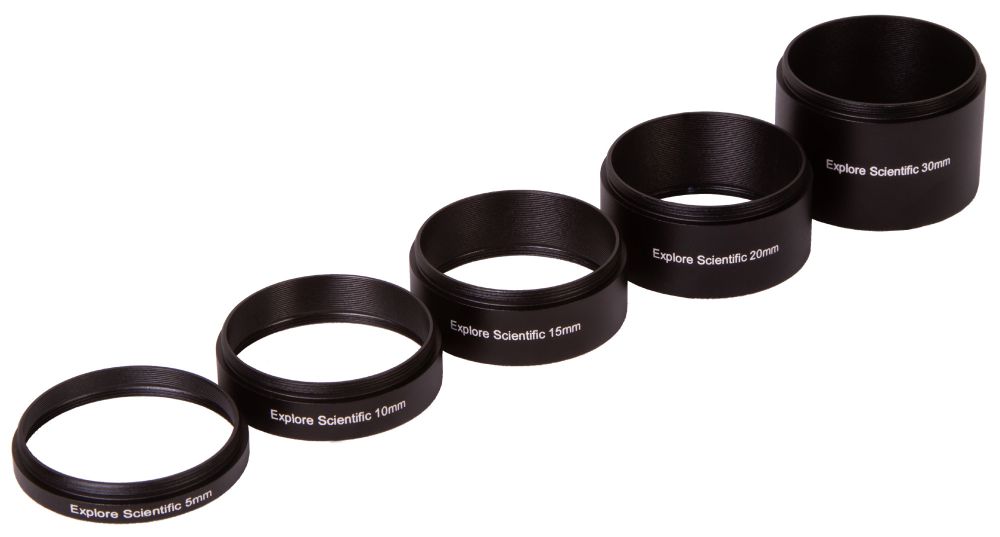 Набор удлинительных колец Explore Scientific предназначен для астрофотографии. В набор входят пять колец (30, 20, 15, 10 и 5 мм), каждое имеет две резьбы M48x0,75 – внутреннюю и внешнюю. Кольца совместимы с корректорами поля, окулярными светофильтрам и адаптерами для байонетов разных цифровых камер. Сделаны из алюминия.