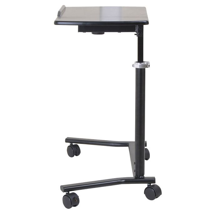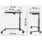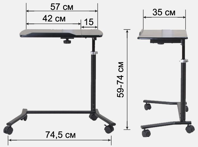 Высота столешницы регулируется в диапазоне от 59 до 74 см. Мягкие колесики не повреждают напольное покрытие и оснащены фиксаторами для дополнительной устойчивости столика.