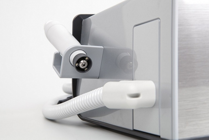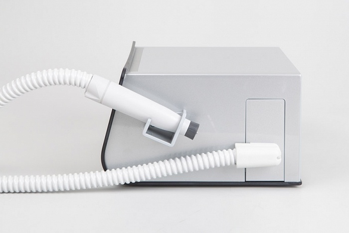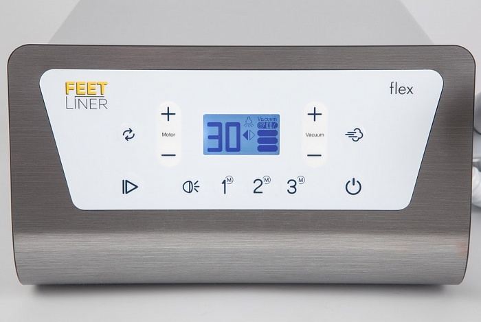 Аппарат для педикюра Flex оборудован мощным встроенным пылесосом и наконечником с LED подсветкой из трех светодиодов. Имеются три ячейки памяти для быстрого перехода к собственным настройкам скорости вращения фрезы и мощности всасывания. Модель оснащена встроенной системой контроля состояния фильтра.