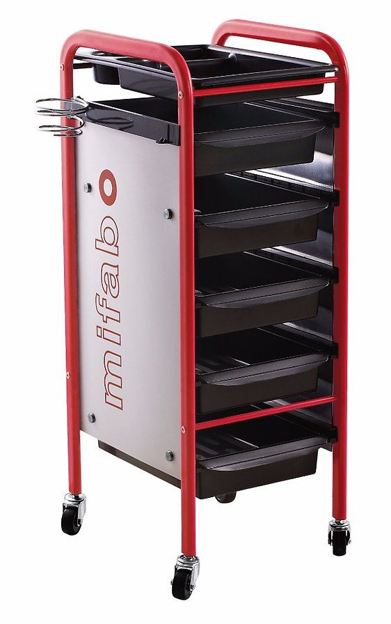 Парикмахерская тележка F-57A имеет металлическое основание, алюминевый корпус, 5 выдвижных ящиков, резиновые колеса, держатель для фена.