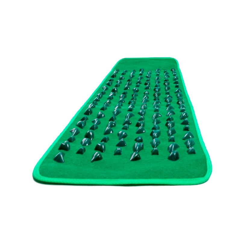 Коврик выполнен из прочной ткани, на которой закреплены камешки из пластика различной формы, всего на коврике 8 рядов камней. Легко сворачивается в рулон, что позволяет без проблем перевозить, хранить коврик.