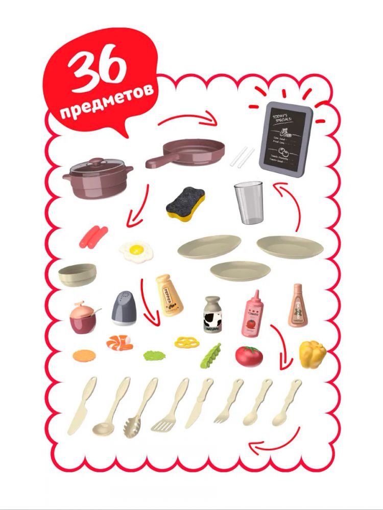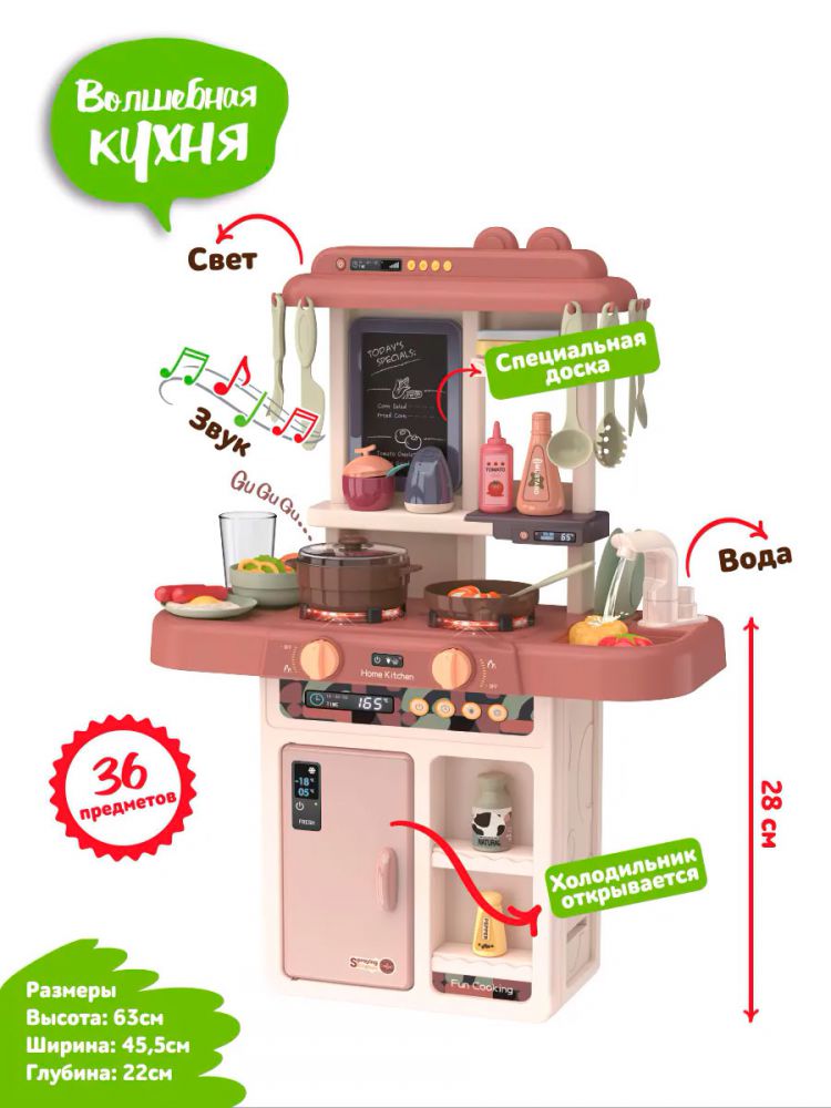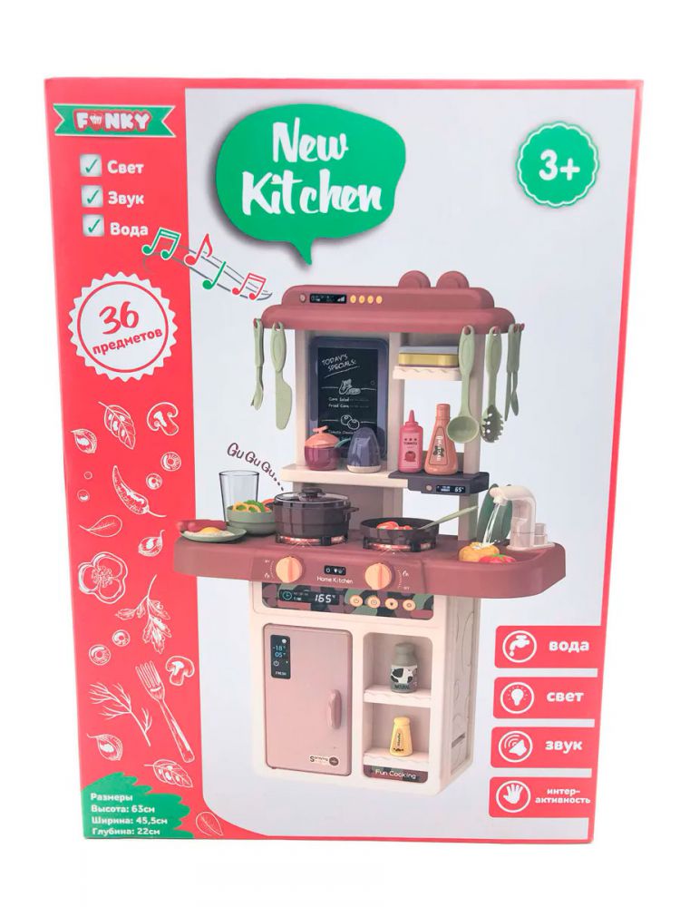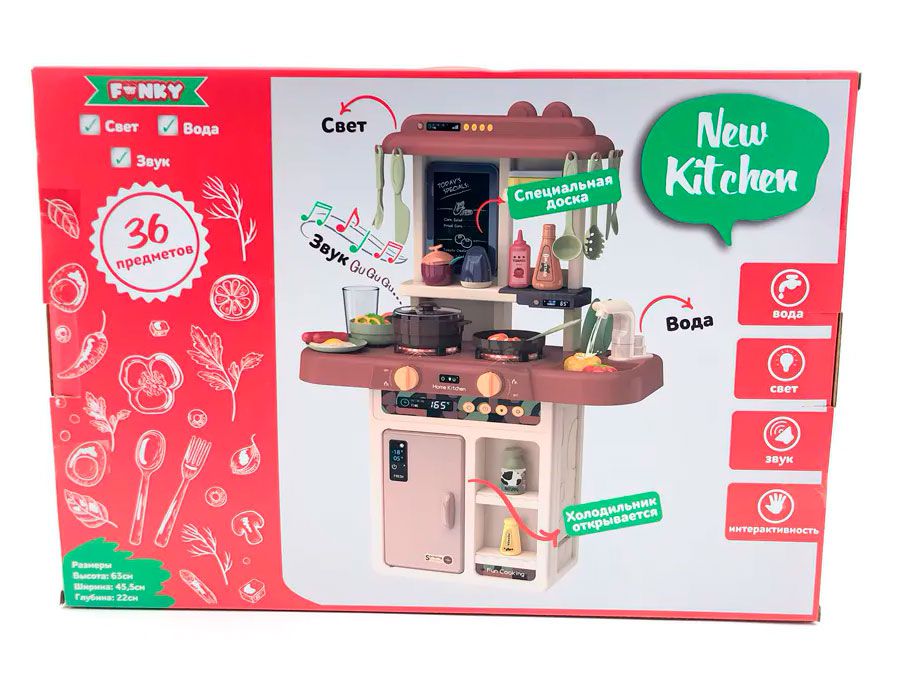 Funky Toys Игровая кухня New Kitchen (36 предметов) - перед вами детская кухня, которая собирается до размеров 45,5х22х63см. Большая кухня с функцией света, звука и подачи воды порадует вашего маленького повара. Особенностями кухни являются две конфорки плиты с подсветкой и звуками приготовления пищи. Также кран мойки оборудован системой подачи воды.