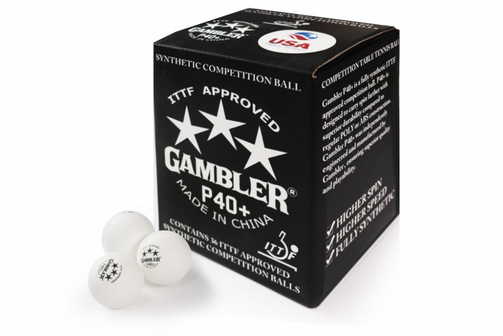 Gambler P40 + - полностью синтетические мячи для соревнований, одобренные международной федерацией по настольному теннису (ITTF). Мячи обладают быстрым вращением, высокой скоростью и полностью являются синтетическими (НЕ ЦЕЛЛУЛОИДНЫМИ). В мячах Gambler используется специальное соотношение смолы АБС, что делает их более твердыми и быстрыми. Конструкция состоит из 2 частей и эти мячи используются почти на каждом профессиональном соревновании по всему миру.