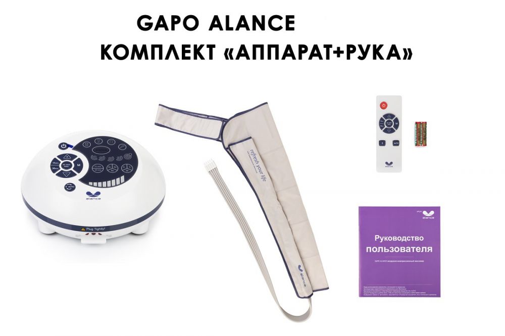Комплект «С рукой» массажного аппарата Gapo Alance содержит в себе на выбор манжеты для руки размера L или XL. Манжета прорабатывает конечность от плеча и до кончиков пальцев. Рукав может использоваться при усталости, после тяжёлых физических нагрузок или в послеоперационный период. Особенно полезна эта манжета для профилактики и лечения лимфостаза верхних конечностей.