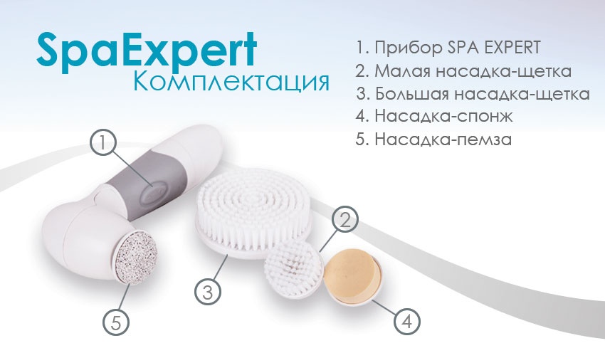 В комплект входят: насадка-пемза, насадка-спонж, большая и малая насадки-щетки. Использование щетки повышает качество ежедневных уходовых процедур за лицом и телом.