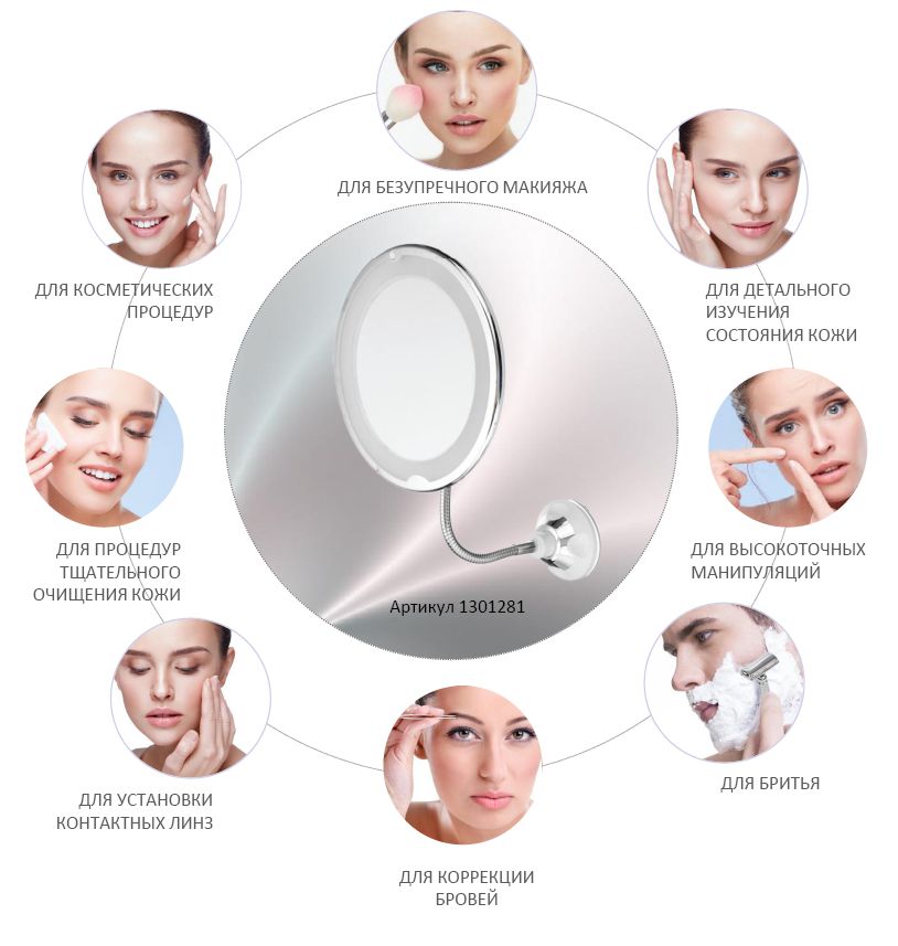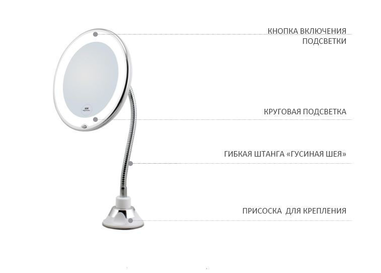 Зеркало косметическое настольное 10x с подсветкой, на гибкой штанге и присоске поможет быстро подкорректировать брови, сделать макияж, различные процедуры по уходу за лицом, побриться. Косметологическое зеркало надежно крепится к гладким поверхностям за счет мощной присоски. Прибор одинаково легко размещается на кафельной стене, на раковине и в качестве дополнения на большом зеркале в ванной комнате, гримерной, туалетном столике.