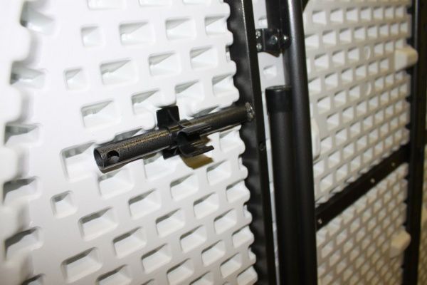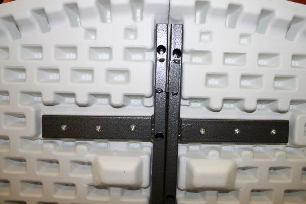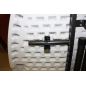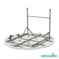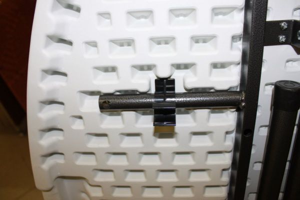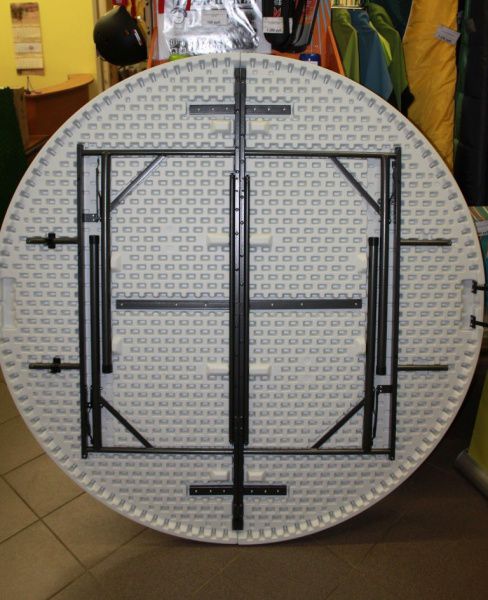 Столешница сделана из белого пластика HDPE толщиной 4.5 см, она закреплена на стальной раме. В конструкции рамы предусмотрены стопорные механизмы, которые препятствуют столу складываться при использовании.