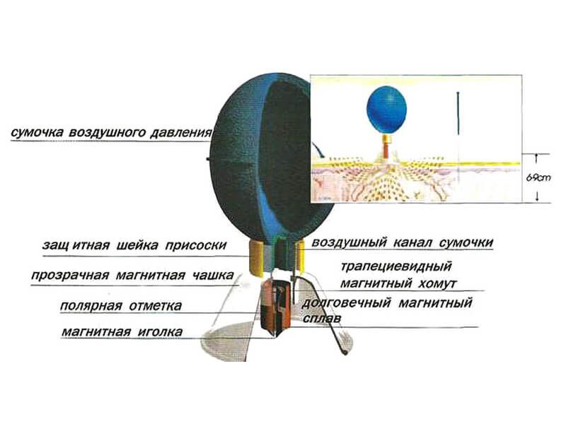Каждая баночка состоит из груши для нагнетания воздуха, твердой емкости и магнита соответствующего цвету полярности, красный цвет – южный полюс, синий цвет – северный полюс. Принцип работы присосок заключается во втягивании кожи за счет отрицательного давления, в акупунктурной точке создается магнитная индукция более 250 мТ, магнитные силовые линии проникают внутрь человеческого тела на глубину около 6-9см .