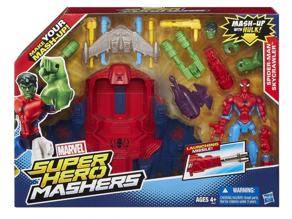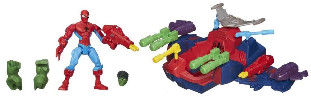 Если Ваш мальчик является поклонником мультипликационных фильмов о супергероях, этот игровой набор не оставит его равнодушным. Разборные фигурки его главных персонажей Халка и Человека Паука являются сборными, их части тела можно переставлять, например, у Человека Паука может вдруг появиться зелёная рука. Это добавит веселья и расширит возможности ролевой игры. Летательный аппарат снабжён огневыми ракетами и легко сможет отразить атаки неприятеля.