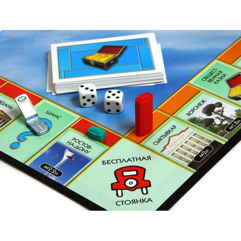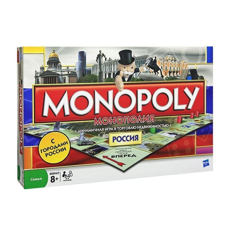Настольная игра Монополия Россия от Hasbro. Настольная игра «Монополия» теперь в России. В игре упоминаются названия 22-х российских городов, а целью сделок становятся местные объекты недвижимости.Целью игры является осознание ребенком основных принципов рыночных отношений, правил покупки и продажи недвижимости, основ стратегического планирования. Кроме экономического аспекта, игра «Монополия в России» имеет образовательный элемент. Игра способствует развитию аналитического и стратегического мышления, закладывает основы будущего предпринимательства, учит вести аукционы, платить налоги, закладывать, покупать или продавать землю и другую собственность.