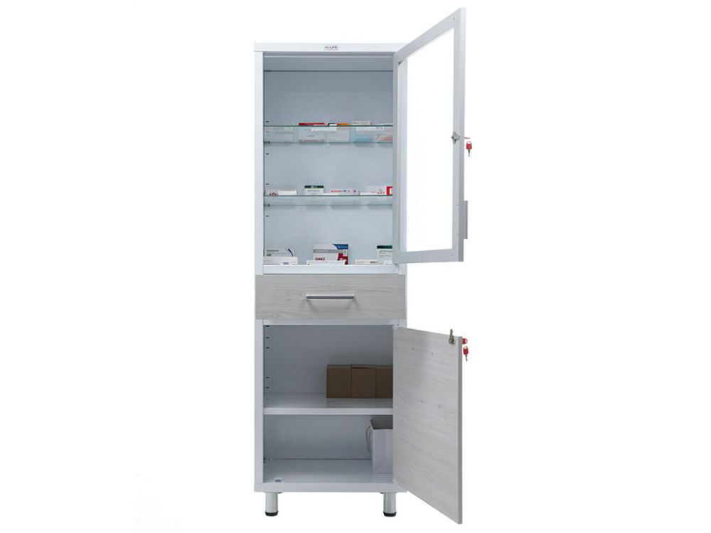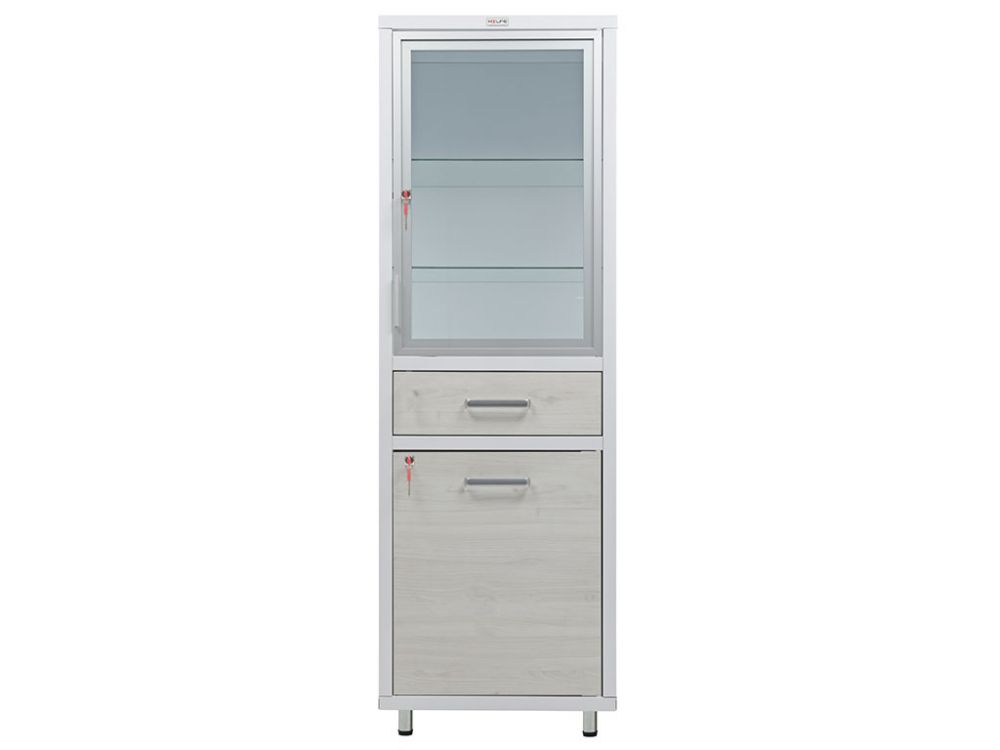 Медицинский шкаф HILFE МД 1 ШМ-SSD, отличается современным дизайном и привлекательным внешним видом. Предназначен для хранения инструментов, медикаментов, больничных документов, карточек пациентов в медицинских учреждениях и организациях. Комплектуется ключевыми замками HILFE (2000 комбинаций). Крепкий корпус изготовлен из стали, покрытый эпоксидным напылением. Модель оснащена стеклянной дверью в алюминиевой рамке, за которой есть две стеклянные полки. Ниже расположен один выдвижной ящик оборудованный доводчиком, обеспечивающий плавное закрывание. Также есть секция с глухой дверью, за которой расположена стальная полка. Фасады шкафов выполнены из ЛДСП. Изделие оборудовано эргономичными алюминиевыми ручками. Лазерная кромка с функциональным полимерным слоем, исполняет роль нулевого шва и улучшает влагостойкость и термостойкость модели.