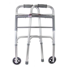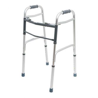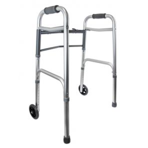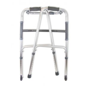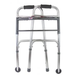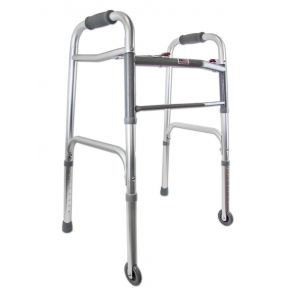 Высота ходунков контролируется перестановкой кнопочных фиксаторов, расположенных на опорных ножках. Места ручной опоры оборудованы прорезиненными не скользящими накладками. Ходунки оснащены фиксирующим одинарным замком. Насадки на ножках исключают повреждения поверхности и добавляют устойчивости конструкции.
