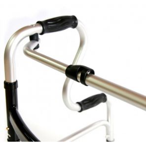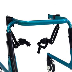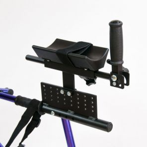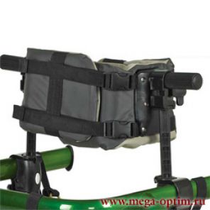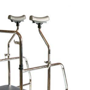Особенностью модели выступает упор под локоть, оснащенный мягкой накладкой. Материал обивки пригоден для очистки бытовыми средствами. В ходунках предусмотрены два ручных захвата, имеющих прорезиненное покрытие. Благодаря колесам передвижение осуществляется методом переката приспособления. Колеса имеют тормозные фиксаторы.