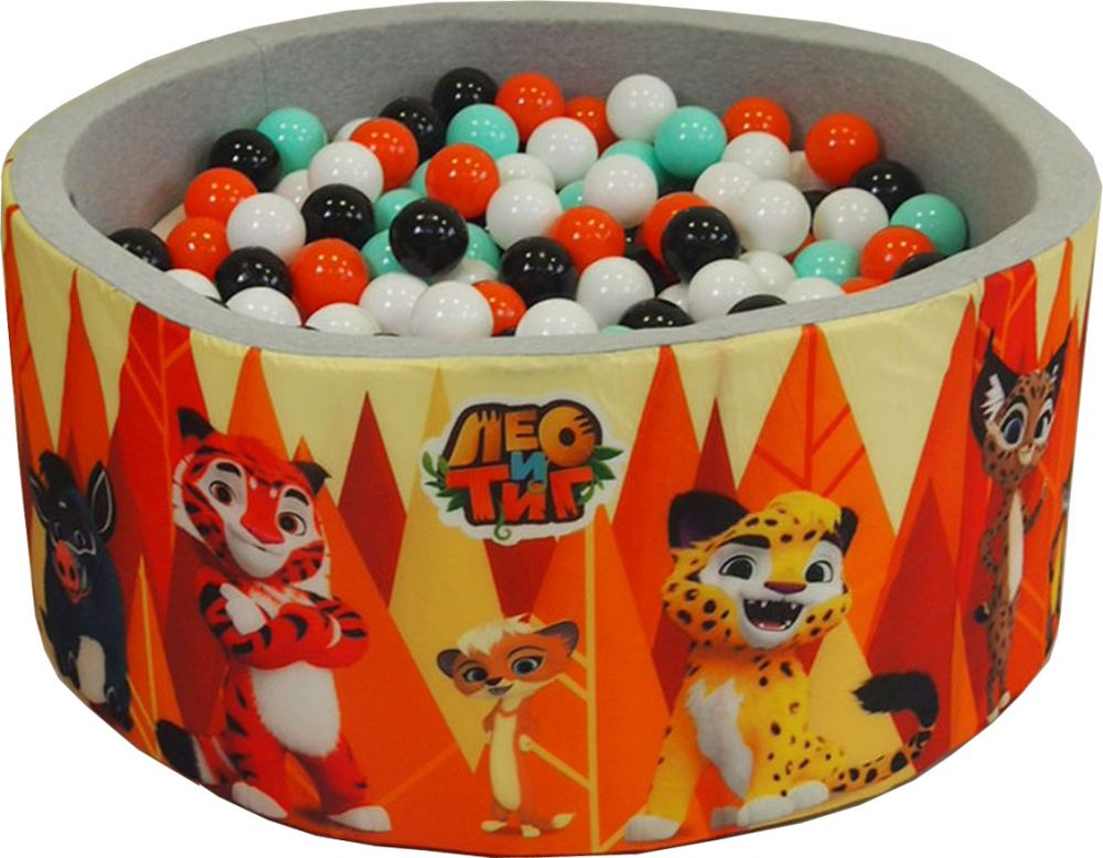 Сухой игровой бассейнвыполнен из мягкого материала, экологичного и гипоаллергенного. Внутри однотонный, а снаружи бортики красочно оформлены изображениями с героями мультсериала «Лео и Тиг». Изделие не имеет острых углов, его можно использовать в качестве манежа для малышей. Крупные шарики безопасны для ребенка. Игра с ними помогает развить координацию движений и мелкую моторику.