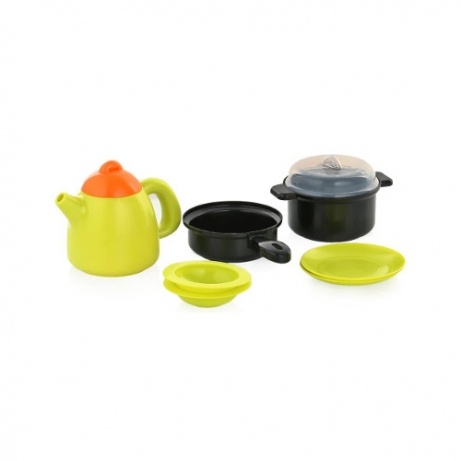 В набор входят кастрюля, сковорода, столовые принадлежности, чайник, сервиз и некоторые пластмассовые продукты питания.