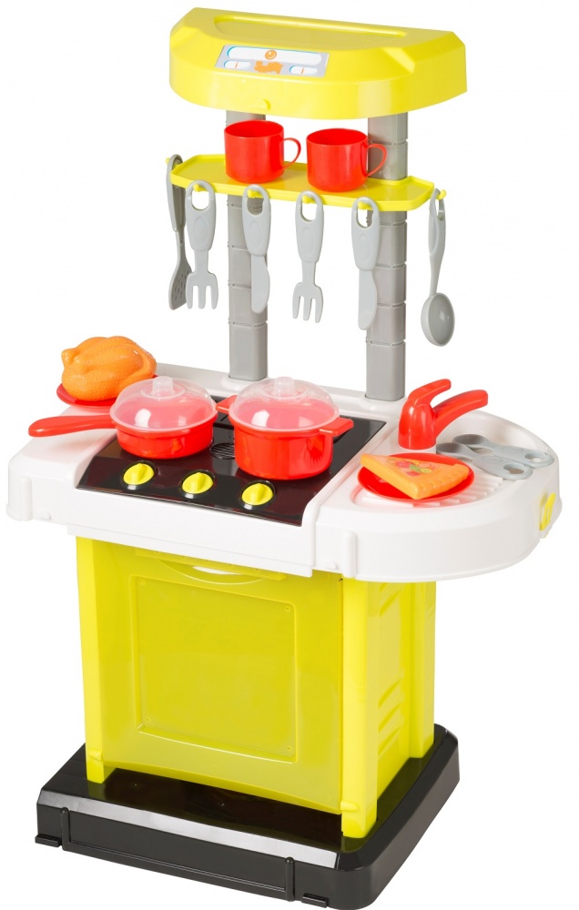 Электронная портативная кухня Smart с мойкой и аксессуарами подходит для сюжетно-ролевых игр. Трехкомфорочная плита с духовкой и раковина сделаны очень детально, что делает игру с ними более интересной и увлекательной. На специальной полочке под вытяжкой стоят две кружки, а на крючках висят столовые приборы.