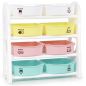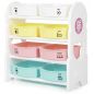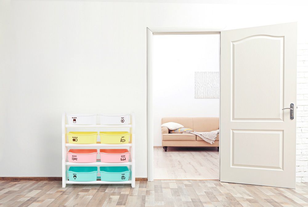 На 4 широких полках стеллажа размещены 8 открытых ящиков. Каждый из них отведён определённой группе детских игрушек и вещей и снабжён соответствующей картинкой. Это помогает ребёнку привыкать к порядку и складывать свои вещи на определённые места.