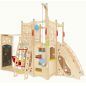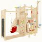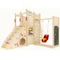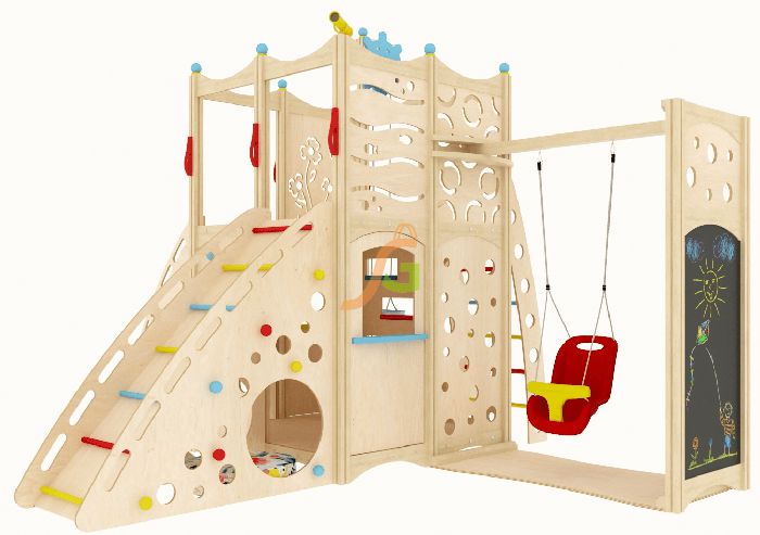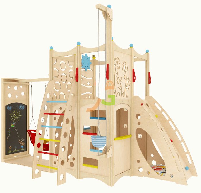 Грамотно продуманное игровое сооружение состоит из нескольких спортивно-развлекательных модулей (качеля, башня и домик под ней, скалодром, лестница, доска для рисования) для детей от 3 до 9 лет. Все элементы конструкции как бы дополняют друг друга, плотно располагаясь, за счёт этого игровой чердак занимает небольшую часть комнаты.