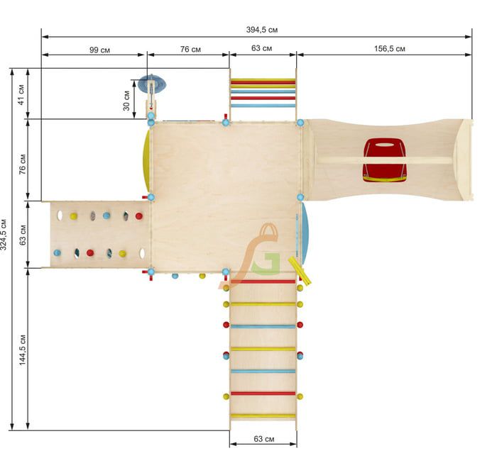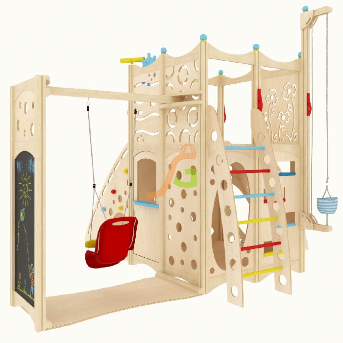 Стенки конструкции имеют множество отверстий и выступов разных размеров. Они не только придают дизайну оригинальности, но и могут быть использованы для преодоления препятствий в игре. Таким образом, развивается выносливость, целеустремлённость, совершенствуется опорно-двигательная система, укрепляется иммунитет.