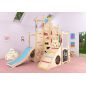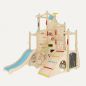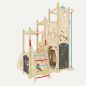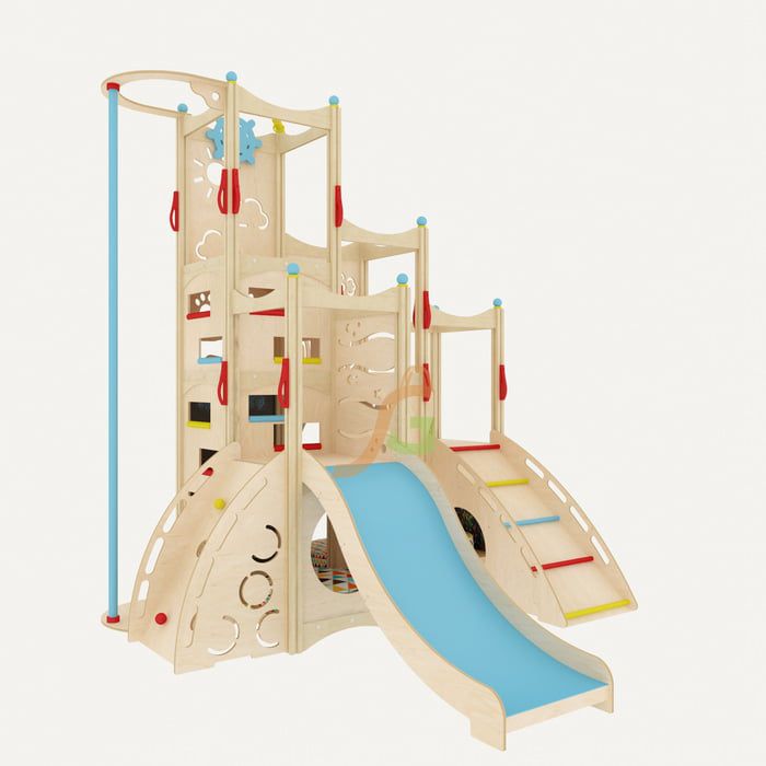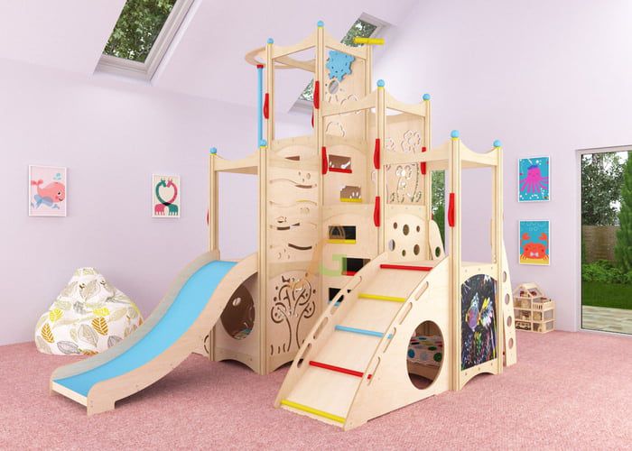 Одновременно игровой комплекс вмещает до пяти детей дошкольного возраста. Они могут кататься с горки, лазать по щитам. Детишки с актёрскими навыками обязательно оценят по достоинству самую верхнюю часть изделия. Здесь можно рассказать стихотворение, спеть песню, воображая себя на сцене. Типовые дополнительные модули пригодятся для постановки ролевой игры.