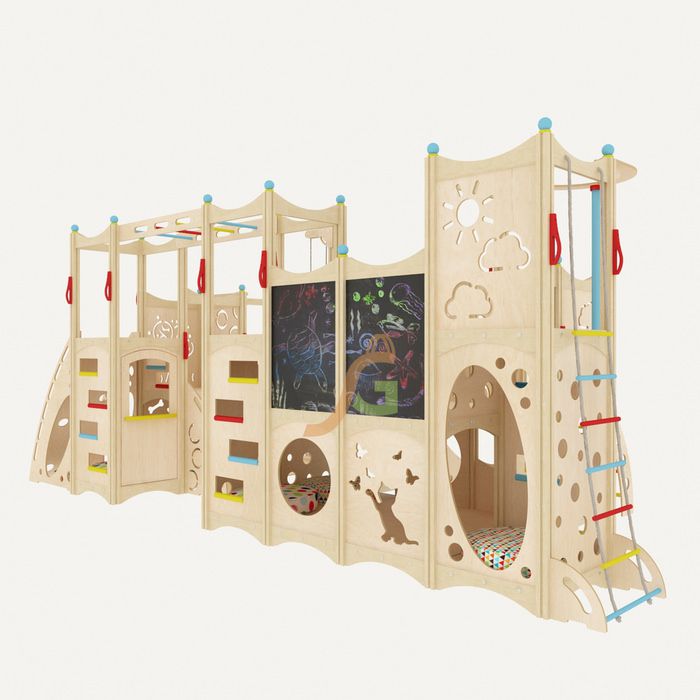 Игровая конструкция включает все модули, необходимые для укрепления всех групп мышц, социального развития малышей. Им даже целого дня не хватит, чтобы изучить этот сказочный игровой замок.