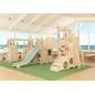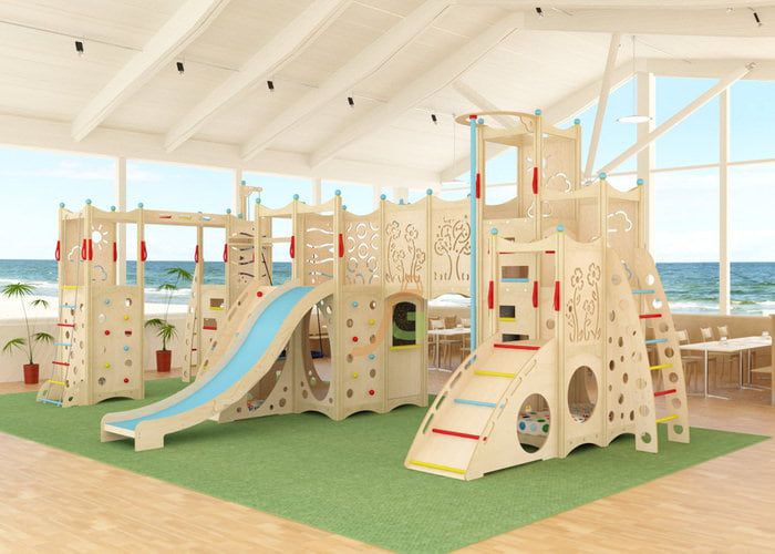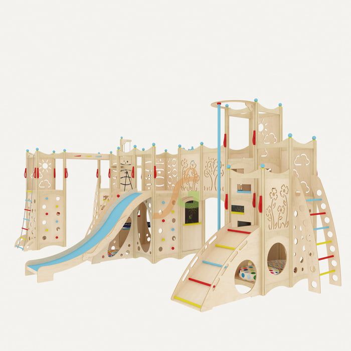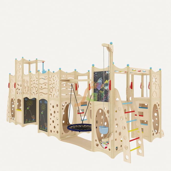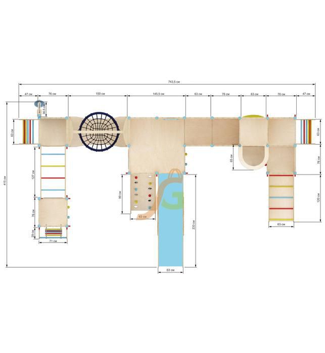Конструкция состоит из 4 частей, которые объединяются с помощью мостиков, подвесных модулей в виде качелей и т.д. Каждый из них оборудован спортивно-развлекательными модулями: горкой, верёвочной лестницей, лесенкой, качелями, рукоходом, шестом.