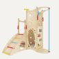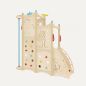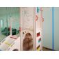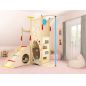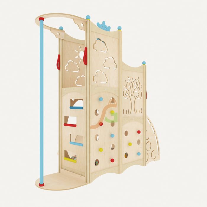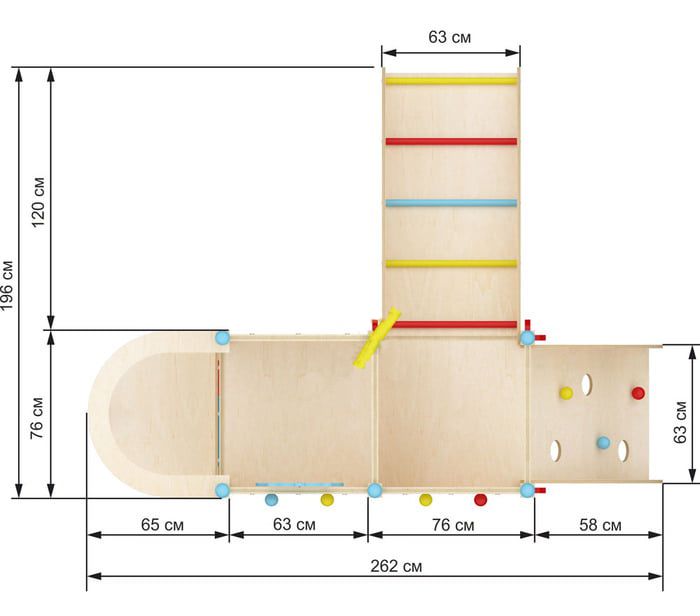 Особое внимание было уделено дизайну конструкции. Благодаря продуманному проектированию домик занимает минимум места и отличается функциональностью. Прямоугольные выемки могут выступать в качестве ступенек, через круглые отверстия малыши могут выбираться из домика, представляя, что преодолевают тяжёлый путь лабиринта.