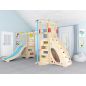 Стильный дизайн модели прекрасно впишется в интерьер квартиры, дома, детского магазина, кафе и пр. Дерево и ненавязчивые разноцветные элементы, фигурные прорези на панелях – конструкция смотрится легко и изящно, несмотря на внушительные габариты.