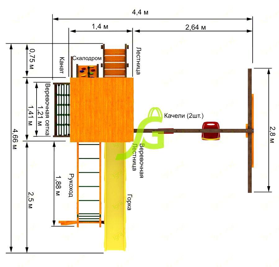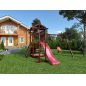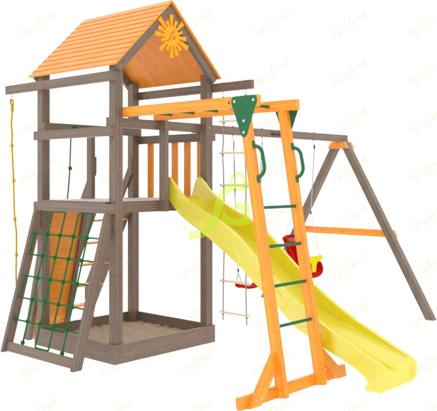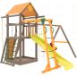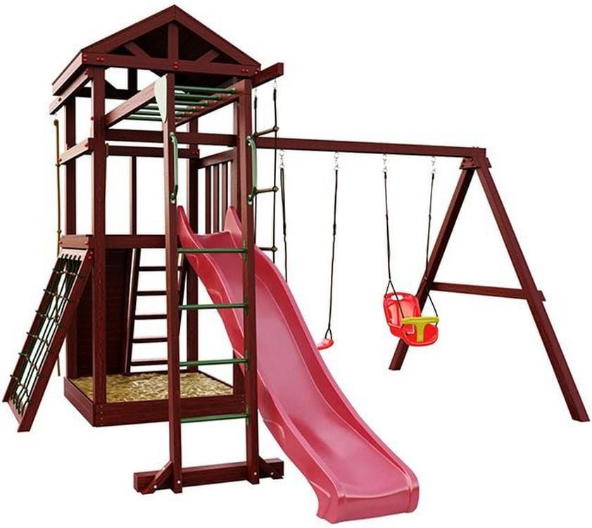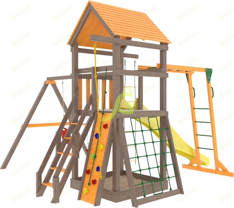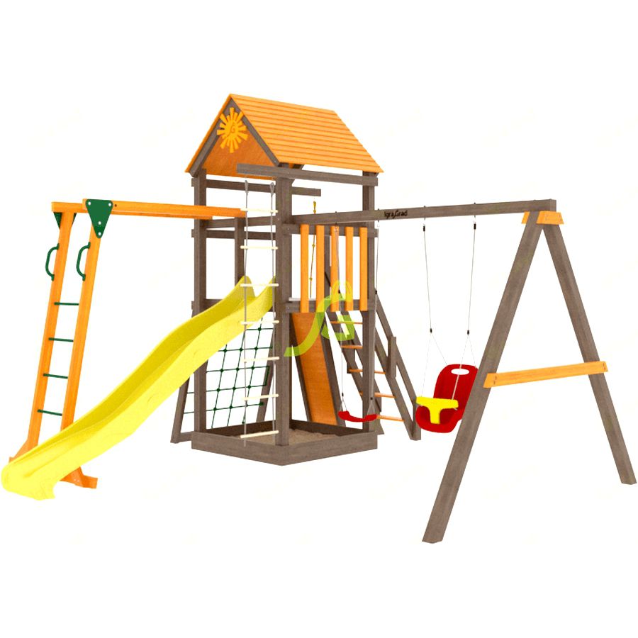 Игровой комплекс изготовлен из дерева и отвечает всем стандартам качества. Вы можете разместить площадку на своем приусадебном участке или даче. Конструкция не займет много места и будет гармонично смотреться на любом участке.