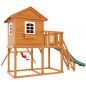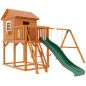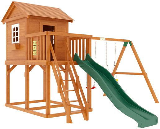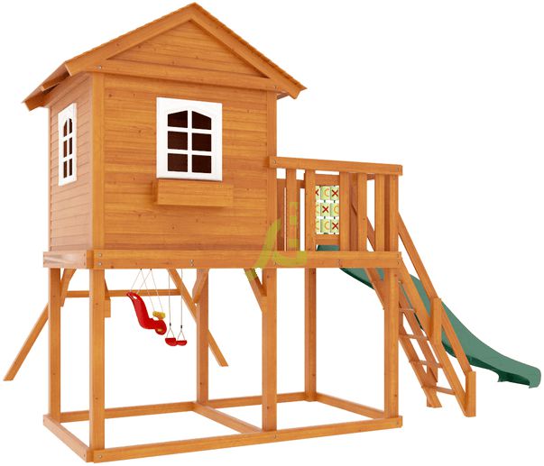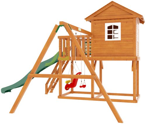 Конструкция двухуровневой башни с крышей комплектуется волновой пластиковой горкой, качельным модулем, лестницей, игрой «крестики-нолики». Под основанием домика преобладает достаточно много свободного места для установки песочницы.